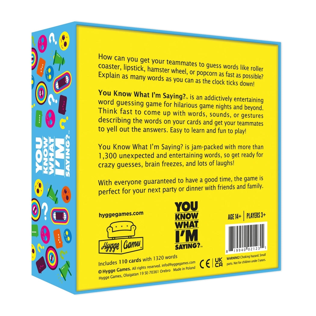 How fast can you get your team to guess words like roller coaster, lipstick, hamster wheel, or popcorn? In You Know What I’m Saying?, every second counts as you race the clock to explain as many words as possible using clues, sounds, or gestures—whatever gets your team shouting the right answer!